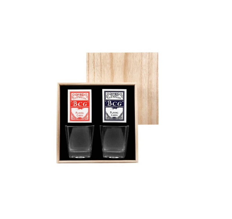 Set de bar con 2 vasos whiskeros de cristal y 2 barajas para juego. Su presentación lo hace perfecto para ocasiones especiales, desde celebraciones personales hasta un obsequio corporativo. Incluye estuche de madera.