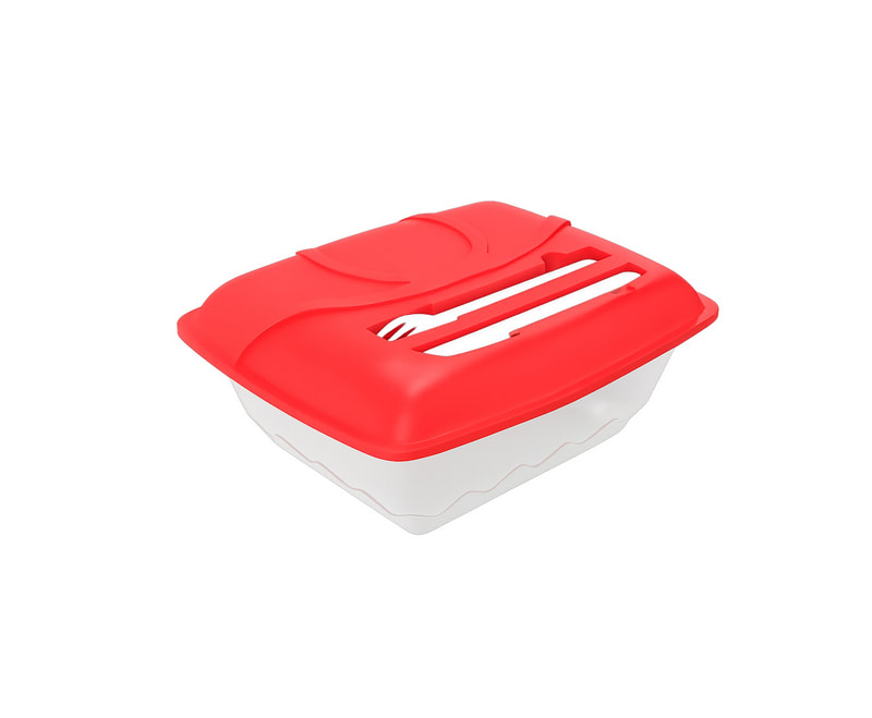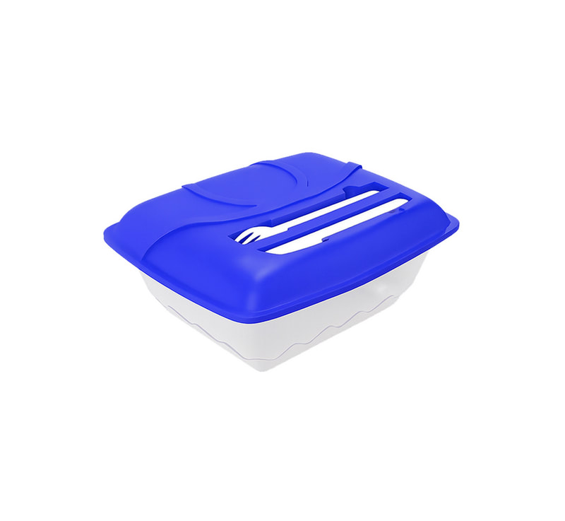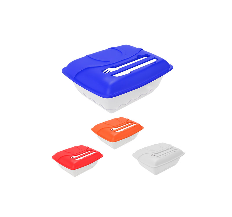 Contenedor de alimentos rectangular con tapa solida que incluye en la parte superior cuchillo y tenedor.