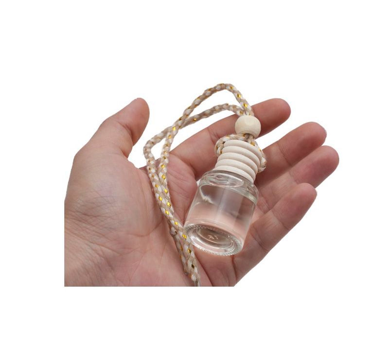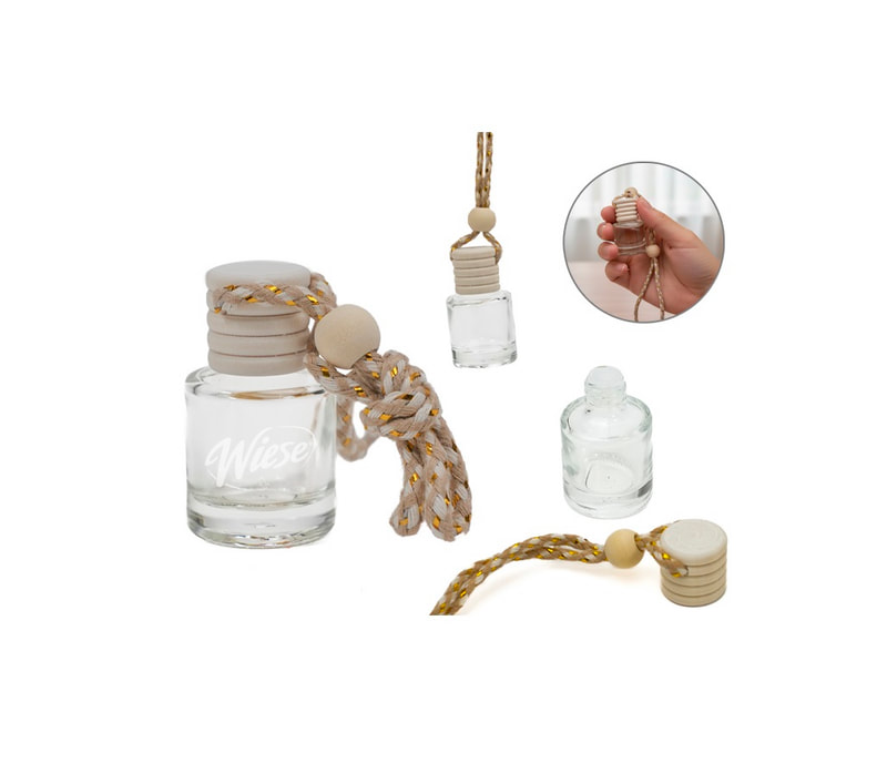 Botella difusora de vidrio de 5 ml. para aceites aromáticos o fragancias, la tapa de madera se impregna y desprende el aroma contenido. Ideal para coches, closets o lugares pequeños. Cuenta con cinta ajustable para colgarse. NO incluye fragancia.