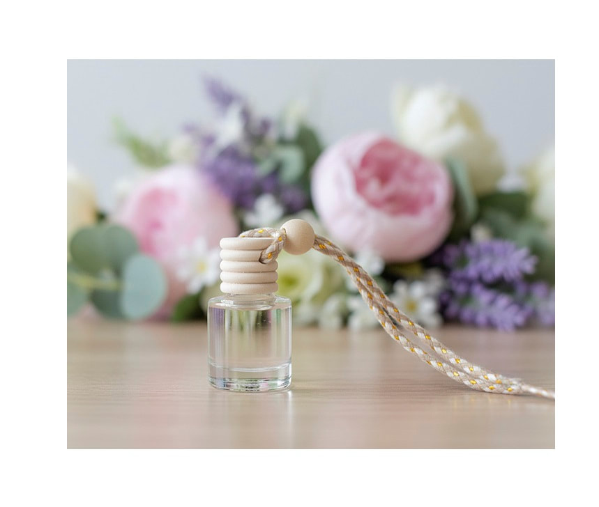 vl 033 Aromatizante con envase de vidrio, tapa de madera y sujedator de cordón. Medidas 5x2.5cm.
