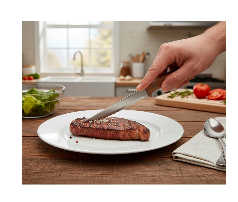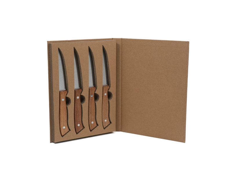 Set de 4 cuchillos de acero inoxidable para carne, con mango de madera de acacia. Presentación: caja individual.