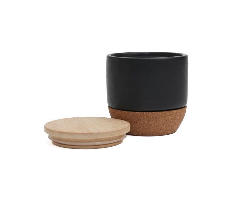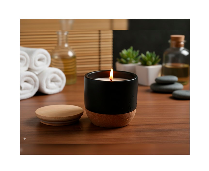 Vela decorativa de cera blanca de soya con concentración de fragancia de vainilla al 2%, en tarro de cerámica con tapa de bambú y base de corcho. Presentación: caja individual.