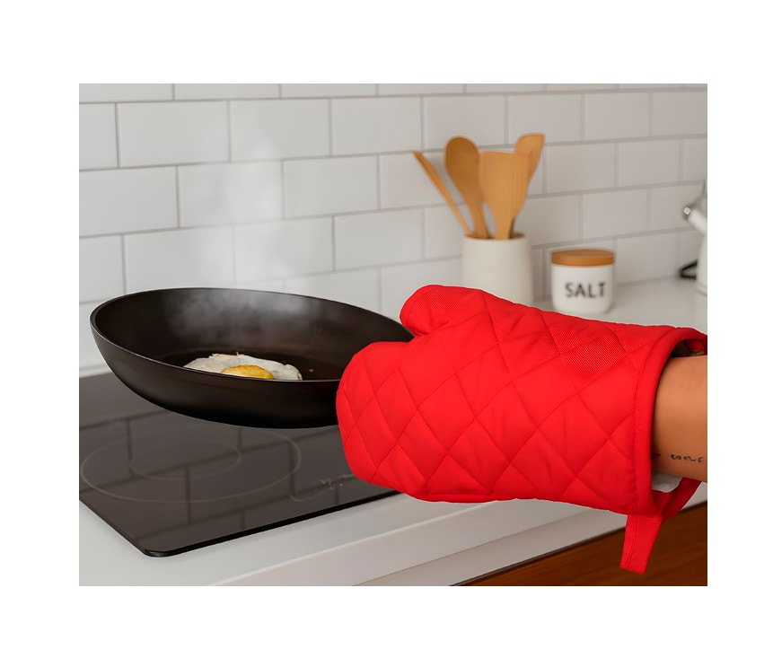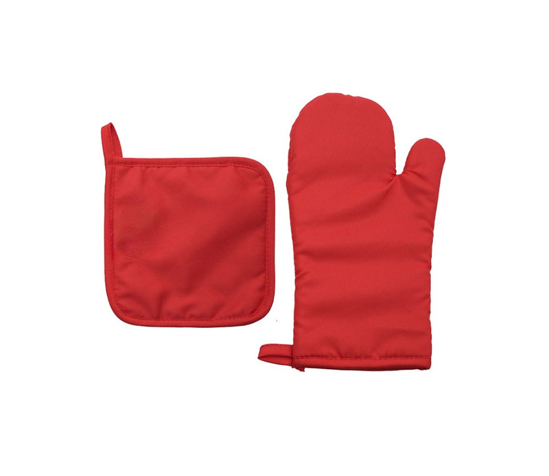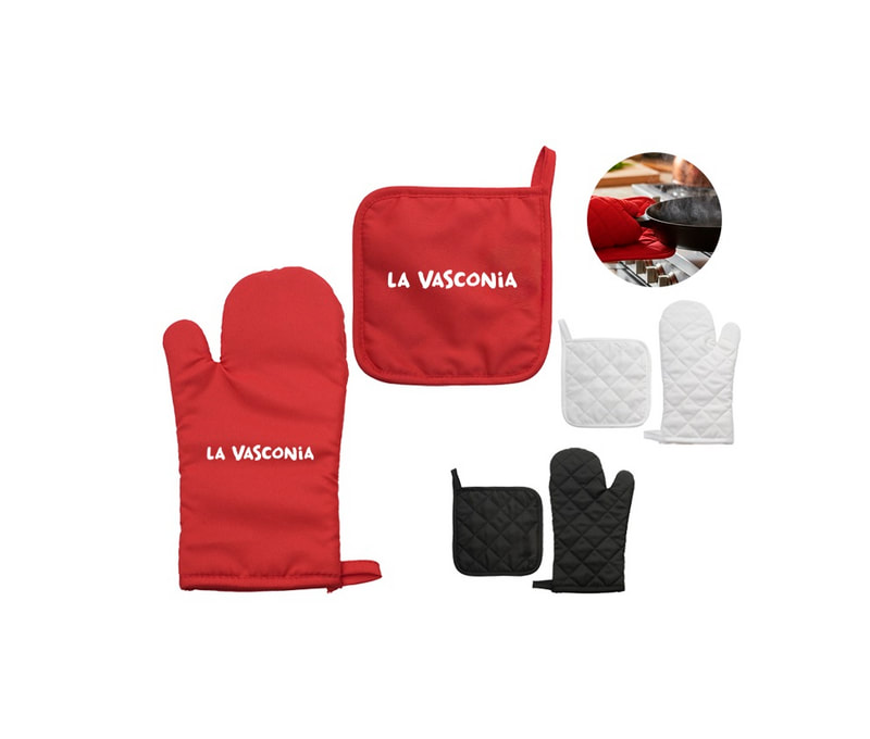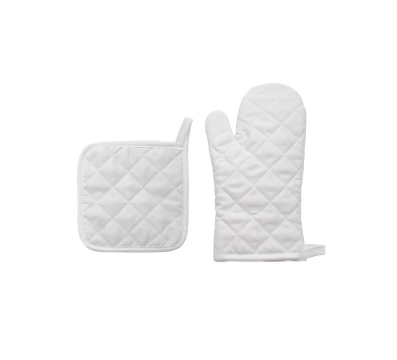 Set de guante para hornear y agarrador de cocina de tela capitonada para proteger del calor. Cuentan con presilla para colgar.