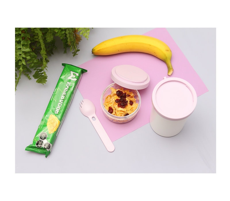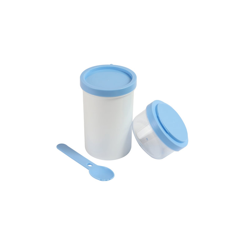 Contenedor de alimentos de plástico con tapa enroscable y compartimento superior para cuchara.
