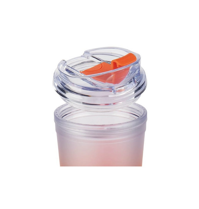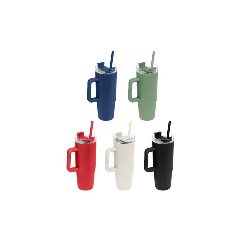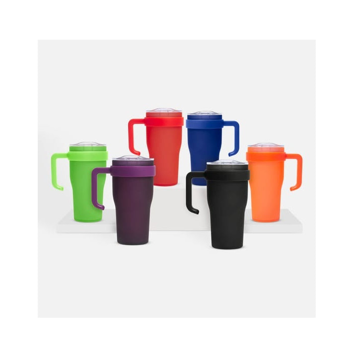 Termo de plástico de doble pared con asa. Cuenta con tapa transparente con cierre de rosca y sobre tapa giratoria en color del termo, con ranura para popote. Incluye popote de color. CAP. 770 ml.