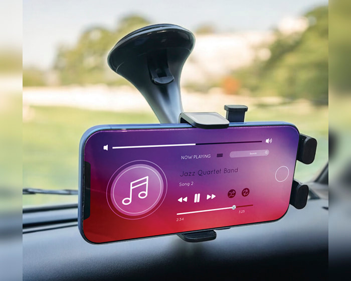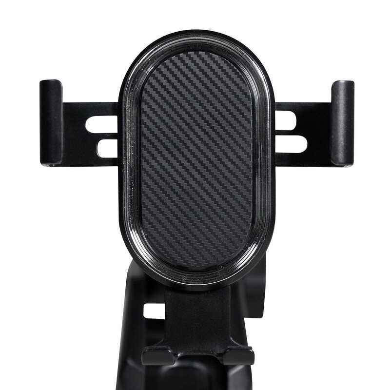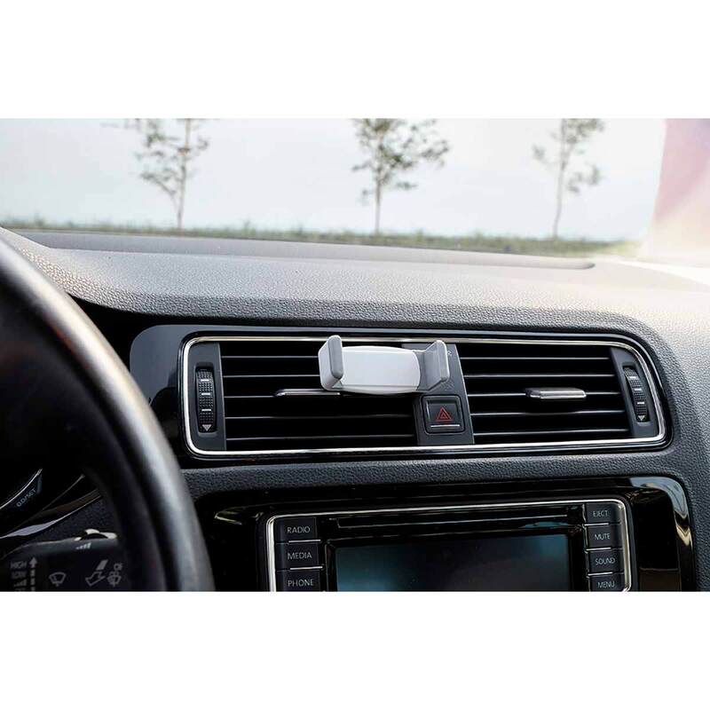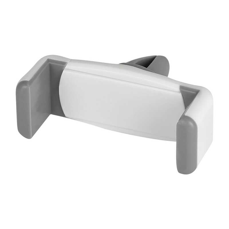 Soporte con mecanismo ajustable para smartphones de 6 a 8 cm de ancho. Ángulo de rotación de 360°. Se monta en las ventilas del aire acondicionado.