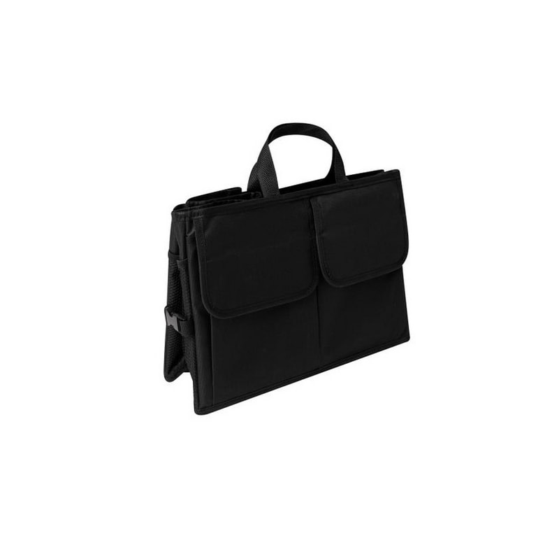 Medidas 51 x 26,5 x 32,5 cm. (abierto). 5 x 26,5 x 32,5 cm (cerrado). Polyester 600D. Organizador. Dos amplios compartimentos de 25,5 cm (aprox) cada uno con dos estructuras de cartón que permiten armar los contenedores. Uno de los compartimentos tiene un bolsillo de red. Manijas recubiertas en plástico. Arandelas metálicas. En la parte inferior contiene velcro que se adhiere a la superficie. Banda elástica que mantiene cerrado el organizador cuando no esta en uso.