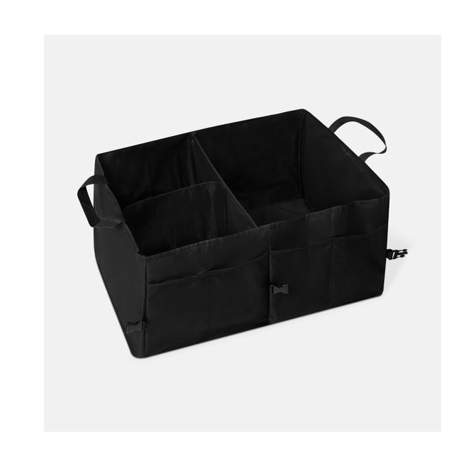 Organizador de cajuela. Diseñado para optimizar el espacio del auto, cuenta con múltiples compartimentos internos que permiten separar y acomodar comestibles, herramientas, artículos de limpieza o accesorios del coche de forma segura. Sus asas laterales facilitan el transporte, y su diseño plegable permite guardarlo fácilmente cuando no está en uso. Cuenta con 4 correas de seguridad ajustables y velcros antideslizantes en la parte inferior, que ayudan a fijar el organizador durante la conducción. Ideal para uso diario, viajes o traslado de compras.