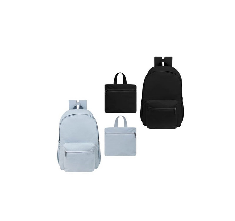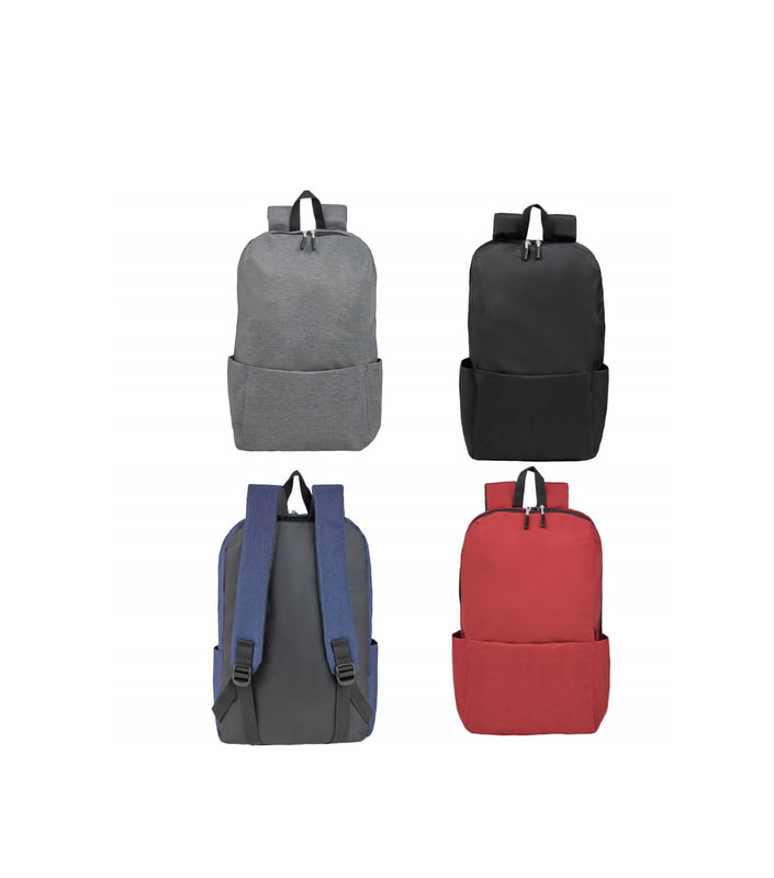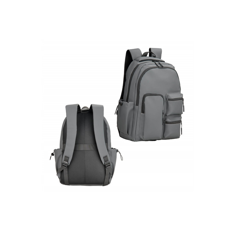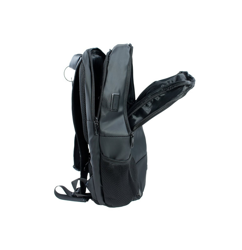 Mochila tipo Backpack fabricada en poliéster, con forro de espuma de polietileno. Cuenta con un compartimento principal con cierre, dentro tienen espacio espacial para guardar una computadora (15 y 15.6 pulgadas) y dos bolsas sin cierre. También tiene dos bolsas laterales y un bolsillo con cremallera en el panel trasero.