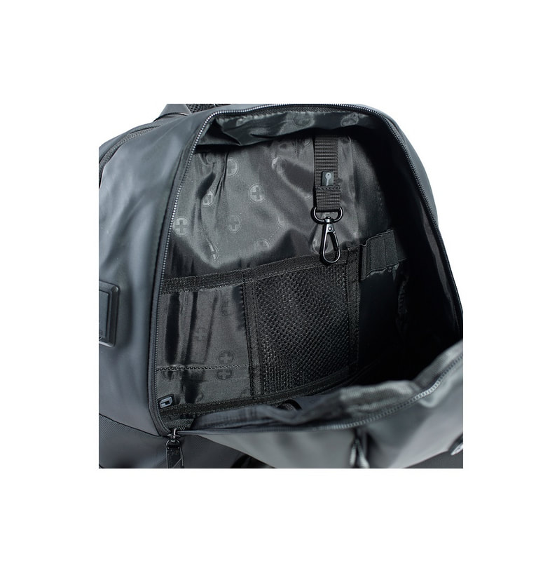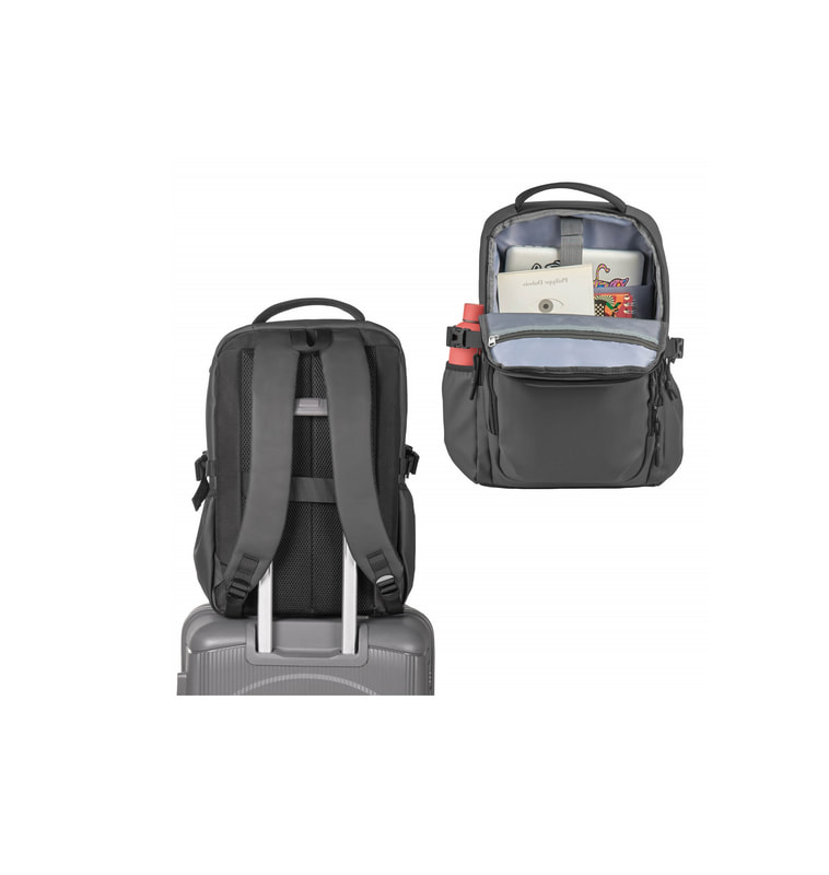 Mochila backpack acolchada repelente al agua con compartimento interno para laptop de hasta 15.6 pulgadas con cinta de seguridad y broche de contacto, otro compartimento interno que abre a 180° con cierre con un bolsillo de malla con resorte para bebidas y otros compartimentos para accesorios, 2 compartimentos frontales con cierre y 1 compartimento en la base con cierre para guardar calzado o snacks, respaldo con tirantes y correas ajustables, cuenta con una banda trasera para sujetarse sobre maleta de viaje y asa para transportar. Contiene un cable con puerto USB para conectar dispositivos móviles.