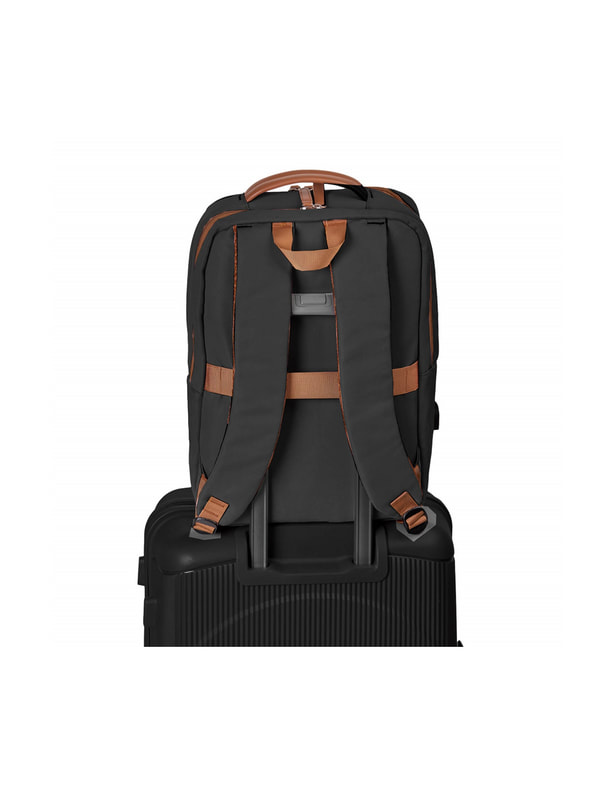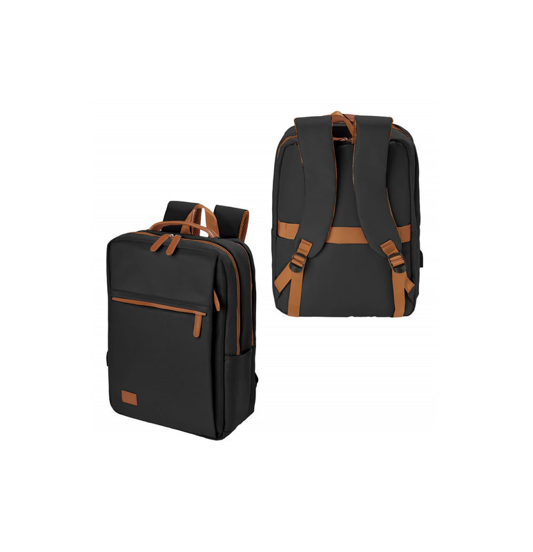 cam2658 Mochila tipo backpack porta laptop de 15.6 pulgadas con diseño tipo curpiel con compartimento que abre a 180º. Interior acolchado con compartimentos para accesorios. Correas acolchadas ajustables con porta lentes y bolsa para accesorios. Banda para sujetarse sobre maleta de viaje y asa superior.