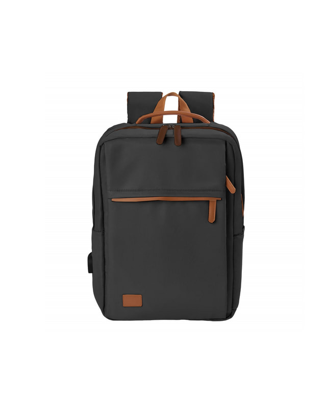 Mochila fabricada en curpiel texturizado repelente al agua. Bolsa frontal con cierre diagonal. Compartimento principal con espacio para laptop de 15.6" y multi organizadores de accesorios (Bolígrafos, tarjetas, etc.). Este espacio cuenta con doble tira cierres con apertura asimétrica.Asas de colgar acolchadas con bandas reflectantes de alta luminosidad, y correa para sujetarse en bastón de maleta. El diseño posterior además de aportar una sensación confortablecrea canales que permiten que el aire circule. Peso: 0.72 Kg. Capacidad: 18.06 Litros.