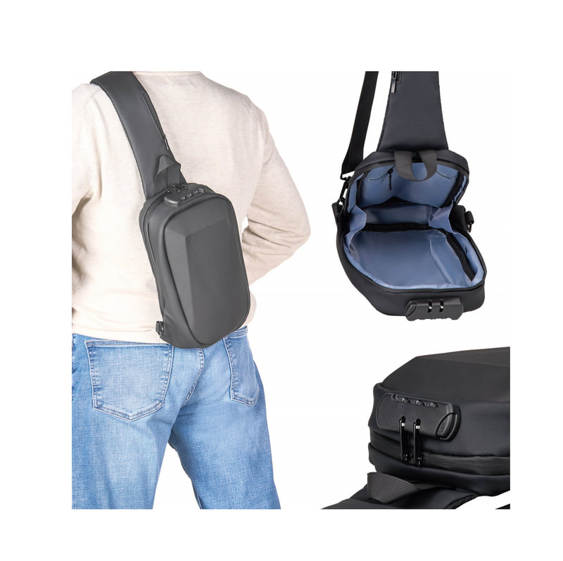 Destacado por su diseño sofisticado con texturas y capas superpuestas. Cuenta con padding en la parte posterior que además de ofrecer comodidad sobresale con su apariencia. Ofrece gran seguridad con un cierre trasero, y versatilidad en su uso gracias a su tirante ajustable que puedes colocar del lado derecho o izquierdo según tu preferencia. Su cierre anti-bloqueo y apertura 180° facilita el acceso. Bolsas interiores que mejoran la organización. Fabricado con materiales resistentes y repelentes al agua fáciles de limpiar. Un complemento elegante y funcional. Peso: 0.5 Kg Medidas 35x19x13cm.