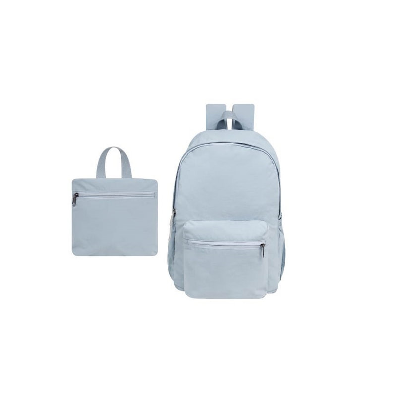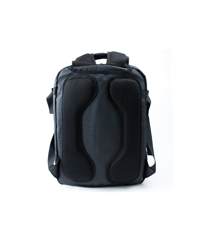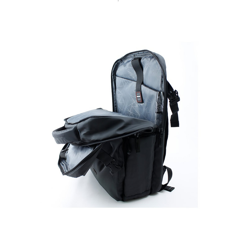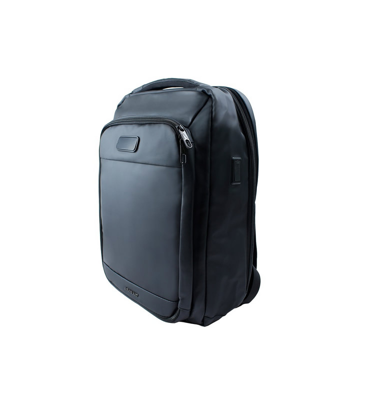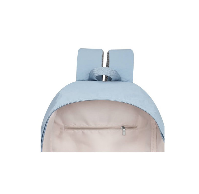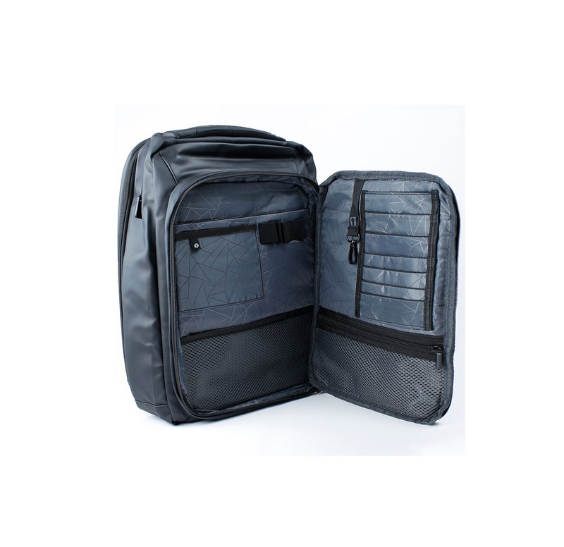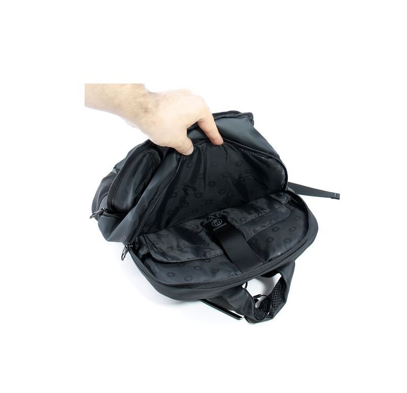 Mochila ultra ligera fabricada en tela repelente al agua con un acabado en teflón que evita adherencias de polvo y facilita su limpieza. Los compartimentos están protegidos por una solapa que se abrocha en la parte frontal. Compartimento principal con espacio para laptop de 15.6" (full padding), y 2 pequeñas bolsas situadas en la parte alta para celular o artículos pequeños que requieran fácil acceso. Cuenta con un par de pequeños broches metálicosen los laterales superiores y un gancho tipo mosquetón en uno de los costados. Asas de colgar acolchadas y correa para sujetarse en bastón de maleta. El diseño posterior además de aportar una sensación confortablecrea canales que permiten que el aire circule. Peso: 0.62 Kg. Capacidad: 11.07 litros.
