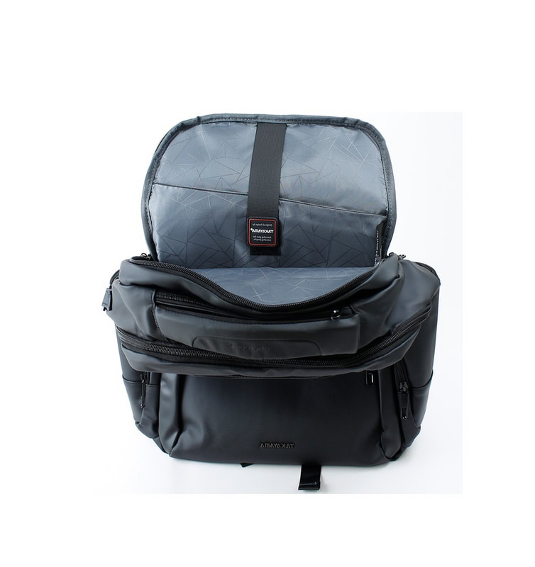 Mochila marca TAKAYAMA, fabricada mayormente en tela, con algunos detalles en curpiel texturizado. Combinación de tonalidades obscuras (negro / gris) y materiales repelentes al agua que la convierten en una opción duradera, funcional y muy práctica debido a su tamaño y ligereza. Compartimento acolchado para Lap Top de 15.6“. Apertura 180° con doble tira cierre. Solapas para ocultar cierres exteriores. Pequeña bolsa frontal de fácil acceso. Cuenta con un par de compartimentos al interior para organizar tarjetas, cables o artículos pequeños. Peso: 0.6 Kg. Capacidad: 16.3 Litros. Medidas 45x33x14cm.