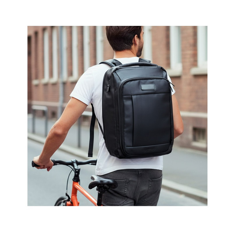 Mochila ejecutiva con compartimento para laptop de 15.6" acolchado, tirantes y panel trasero acolchados, dos bolsillos de malla para botellas de agua, bolsillo oculto delantero, orificio de paso de cable de fácil acceso, detalles reflectantes para una mayor visibilidad y asa de transporte cómoda y práctica.