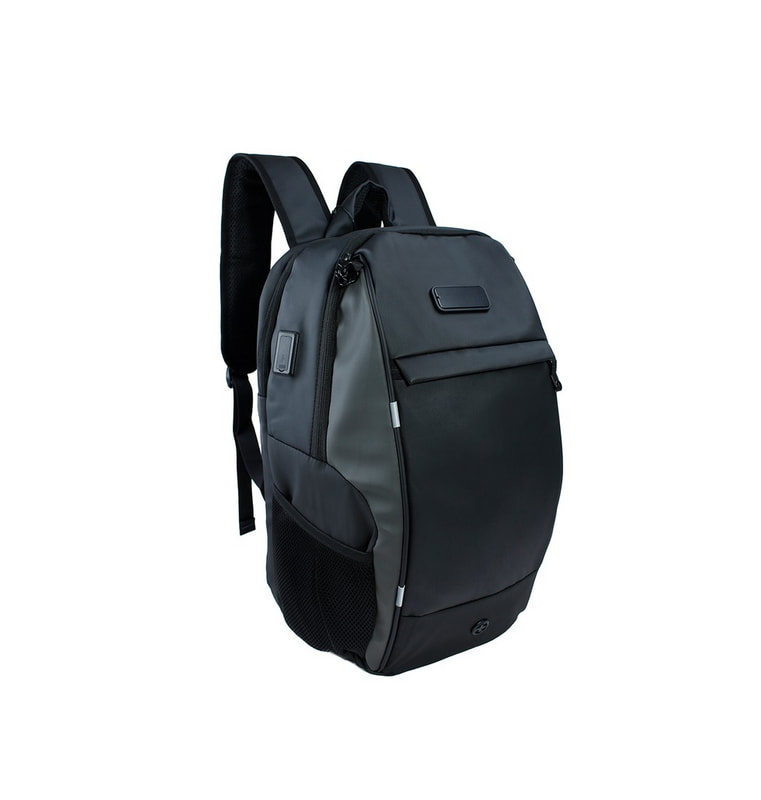 Resisntente al agua con porta laptop de 15 pulgadas, cierre invisible, bolsillo oculto, puerto usb y multiples compartimentos interiores y exteriores. Colores gris y negro.