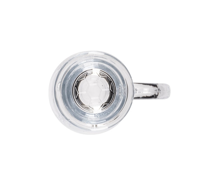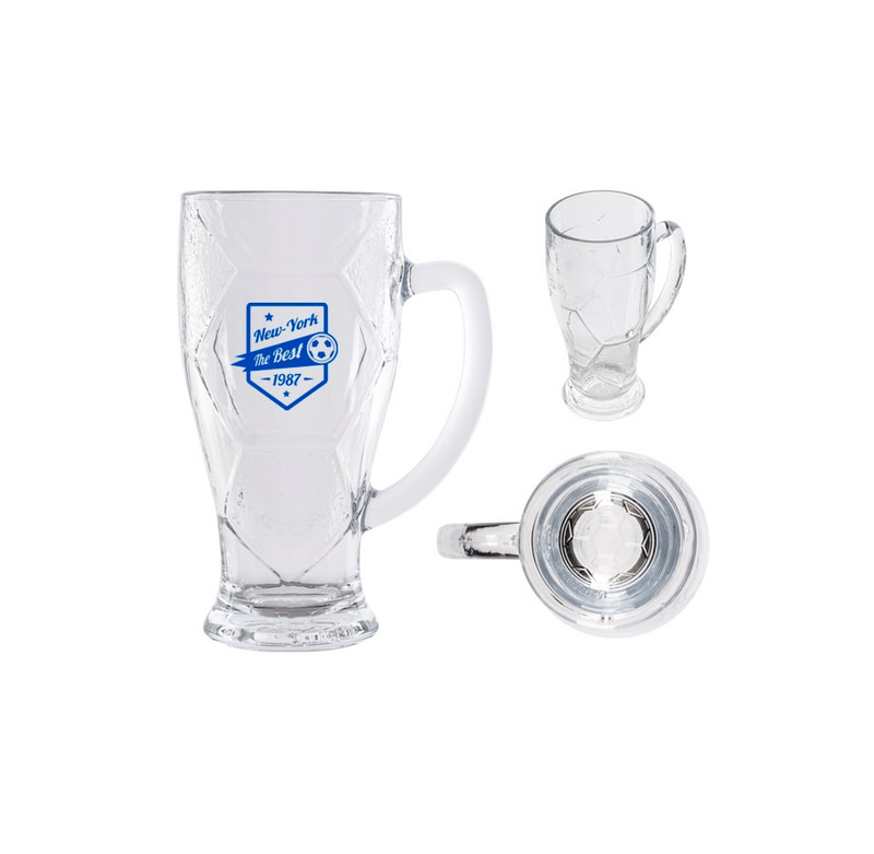 Vaso cervecero de vidro con figura de balón fusionada al cuerpo. Diseño divertido y original que resalta la pasión futbolera. Capacidad de 16 Oz. Base de 6.5 cm de diámetro. Incluye caja individual.