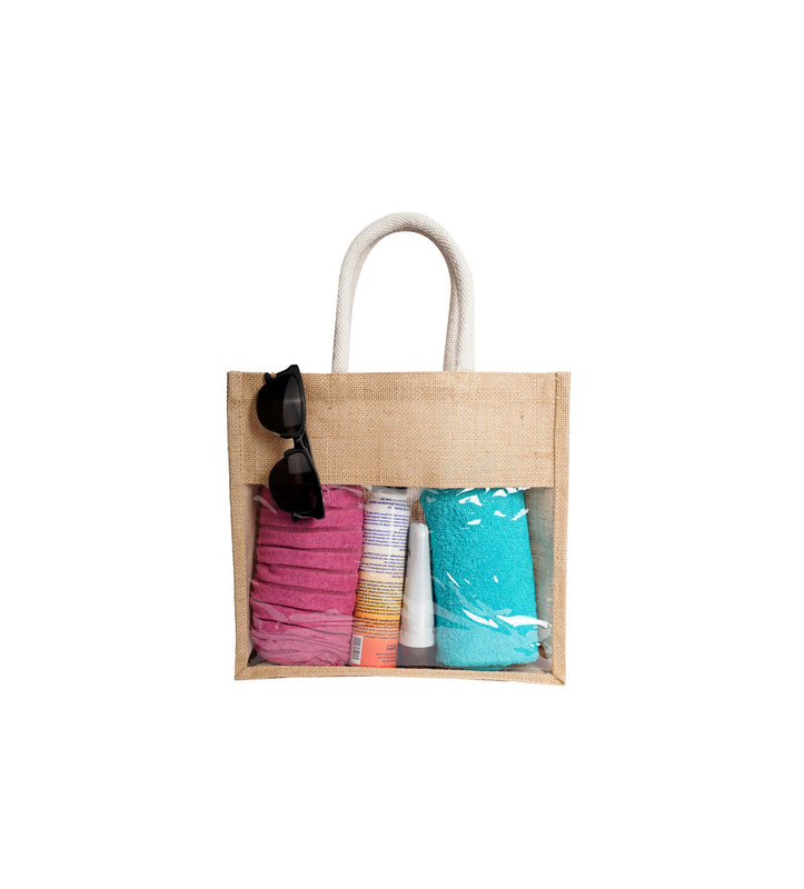 Bolsa de playa fabricada en poliéster y yute; con asas tipo jareta.