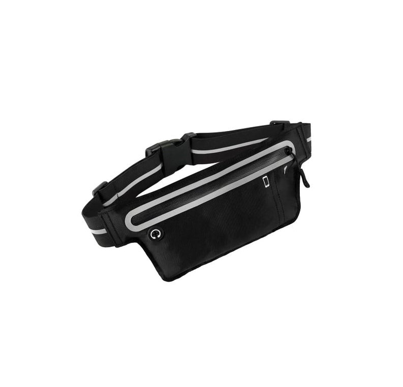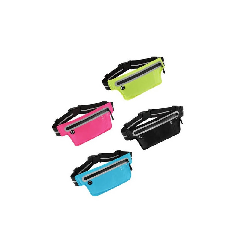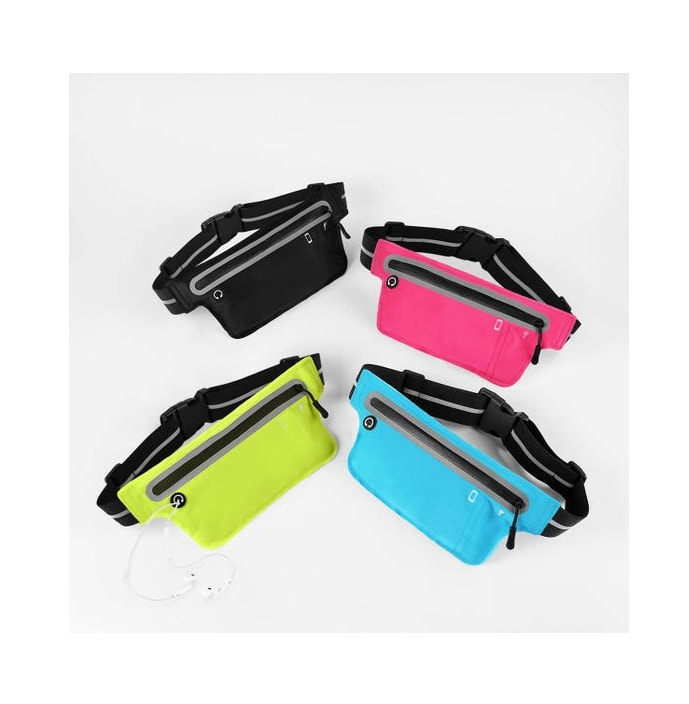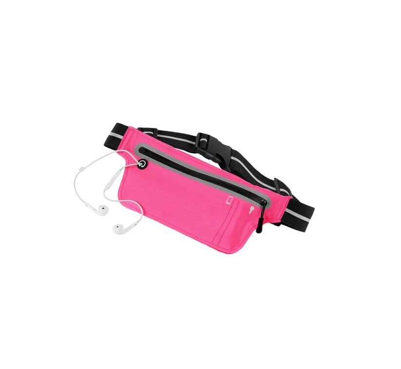 Cinturón deportivo fabricado en poliéster, 3 bolsillos con cierre, tiras reflejantes y salida para audífonos en la parte del frente.