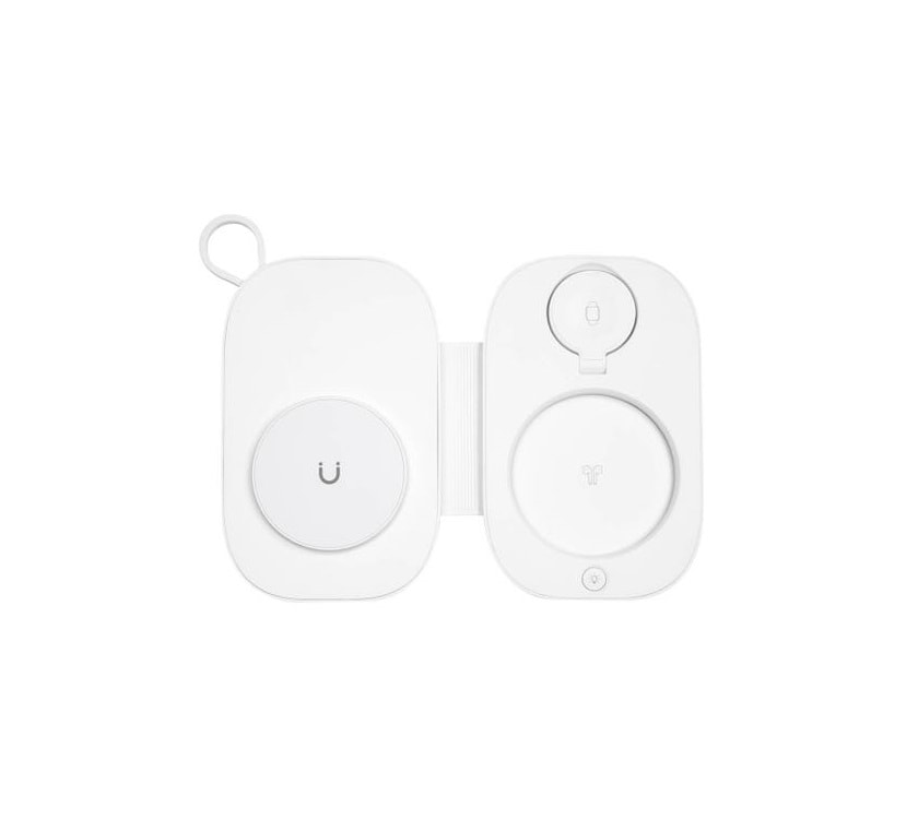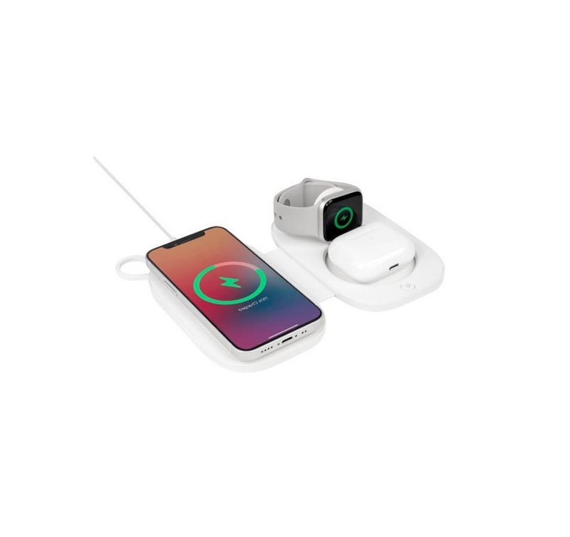 Cargador magnético para casa, oficina o viaje 3 en 1 plegable wireless de 15 w, material plástico ABS+PU, para celular, audífonos y reloj, carga rápida, multi función, compacto y fácil de transportar.