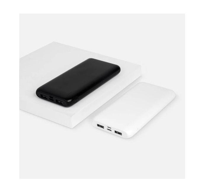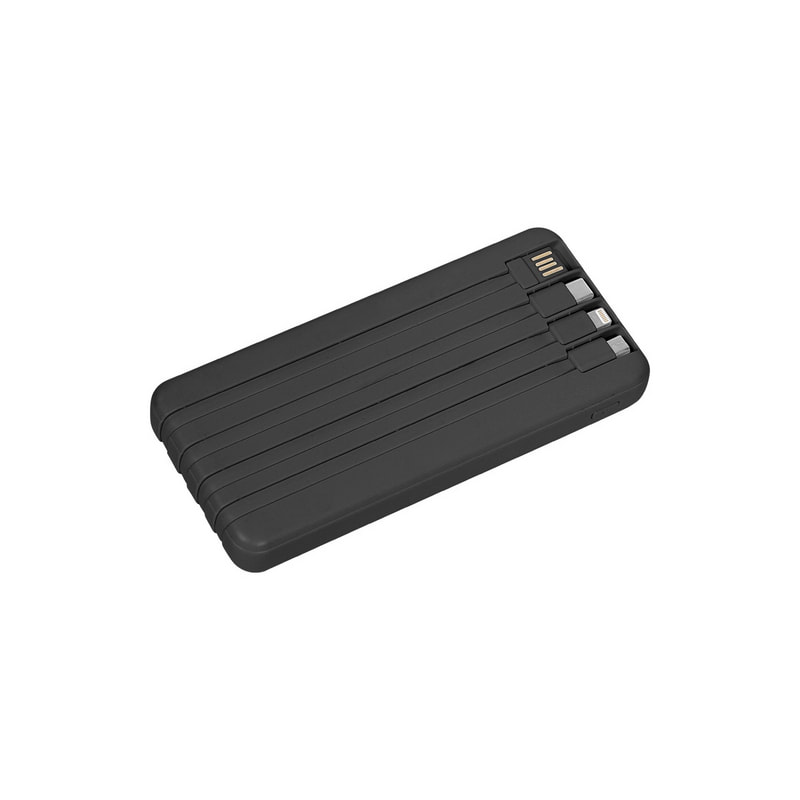 Power Bank de 10,000 mAh, fabricado en plástico ABS, con 2 cables de carga integrados y pantalla led que muestra nivel de batería. Incluye caja de cartón individual.