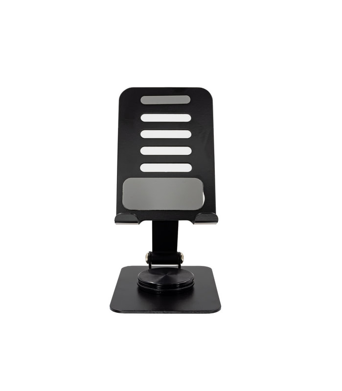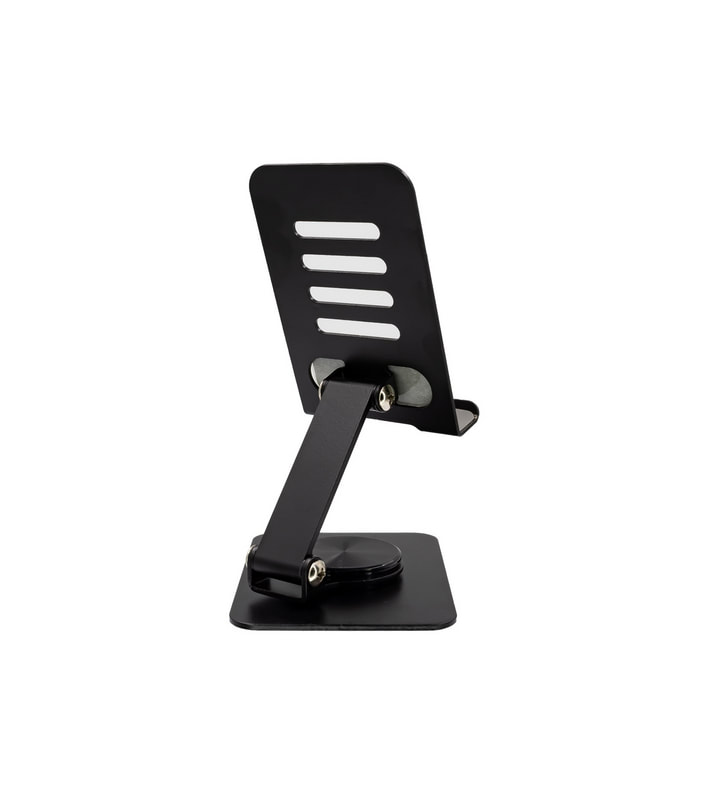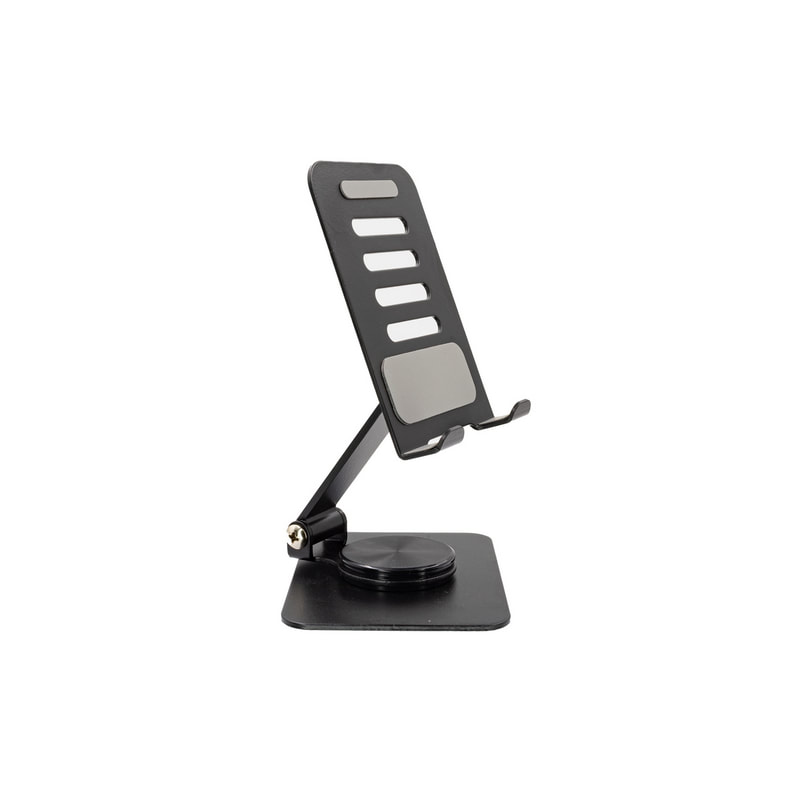 Soporte universal con diseño plegable. Incluye una base giratoria de 360° que permite un fácil ajuste y personalización, lo que garantiza un ángulo de visión cómodo para el usuario. Desplegable a una altura máxima de 20 cm.