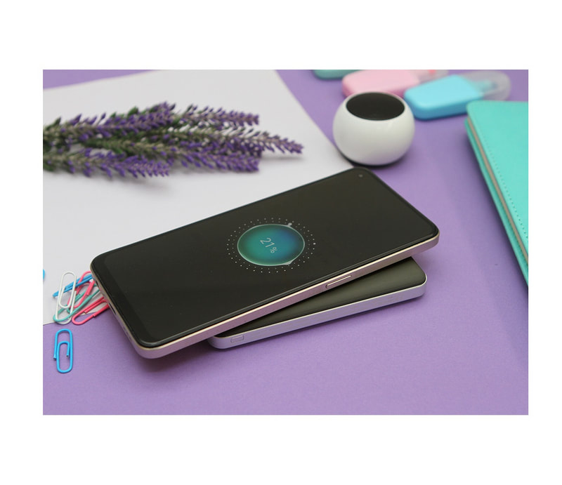Batería auxiliar para smartphone, capacidad 5,000 mAh con carga inalámbrica. Led que indica nivel de carga. Puerto tipo C y USB. Holder en la parte trasera. Potencia de carga 5W. Incluye cable cargador compatible con USB y tipo C.