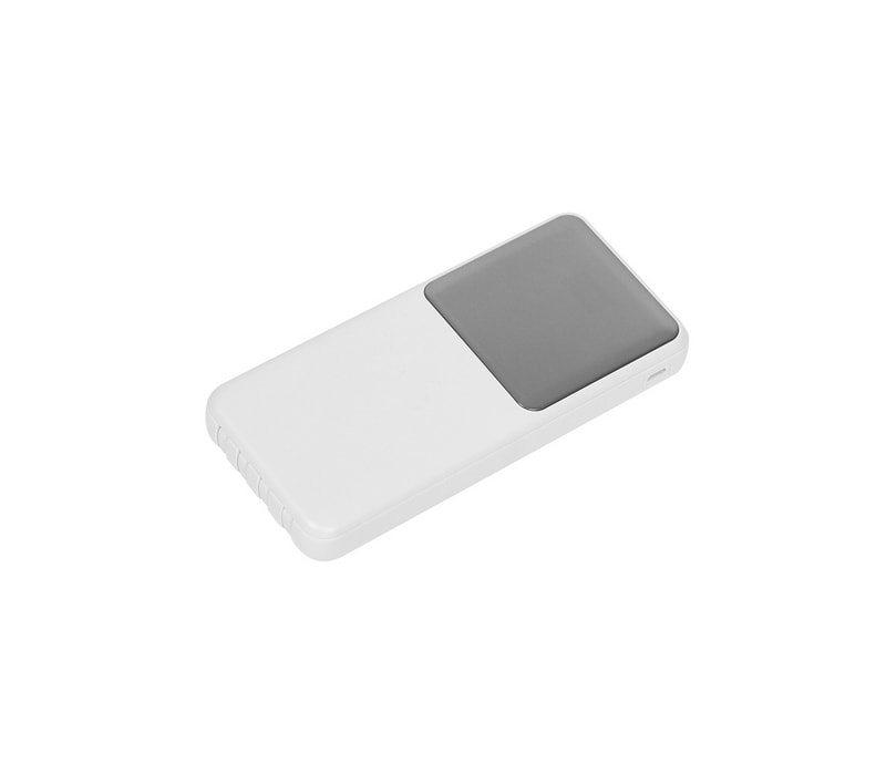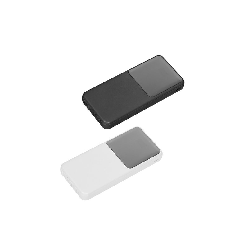 Power bank cuadrada fabricada en plástico ABS acabado brillante tipo piano, con display indicador de carga, 2 entradas USB, entrada tipo C y lampara, capacidad de 10,000 mAh.