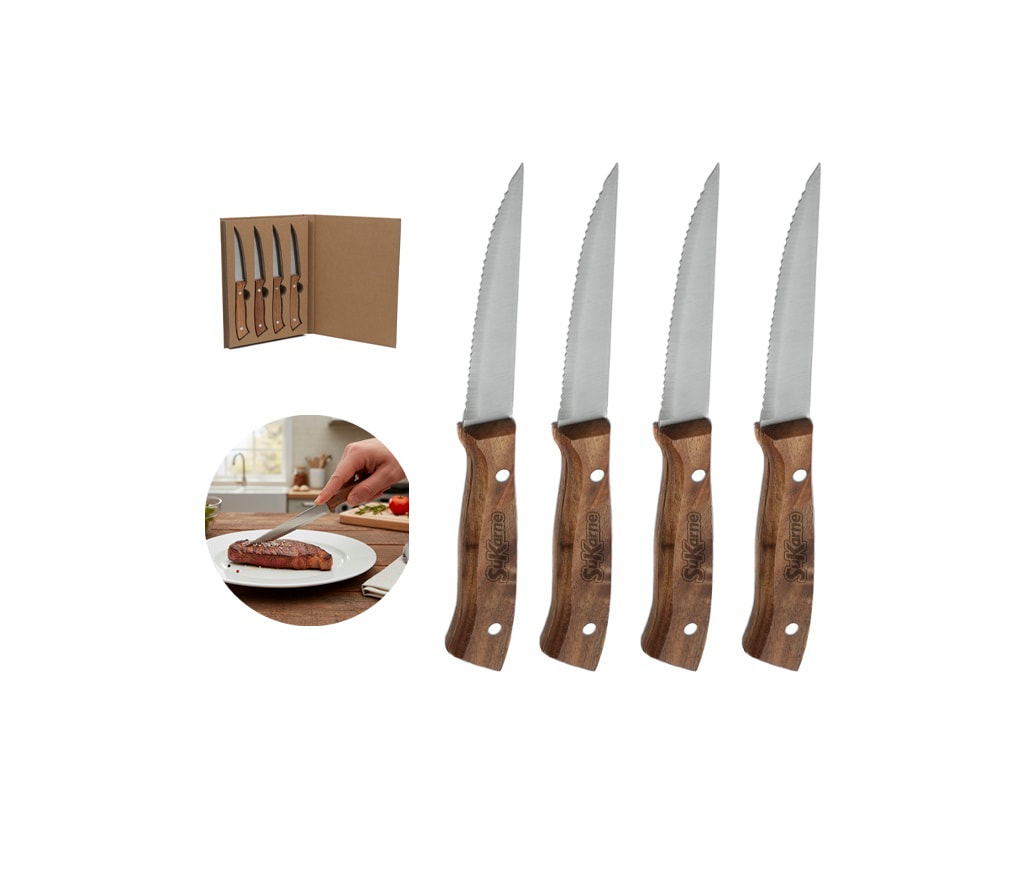 Set de 4 cuchillos de acero inoxidable para carne, con mango de madera de acacia. Presentación: caja individual.