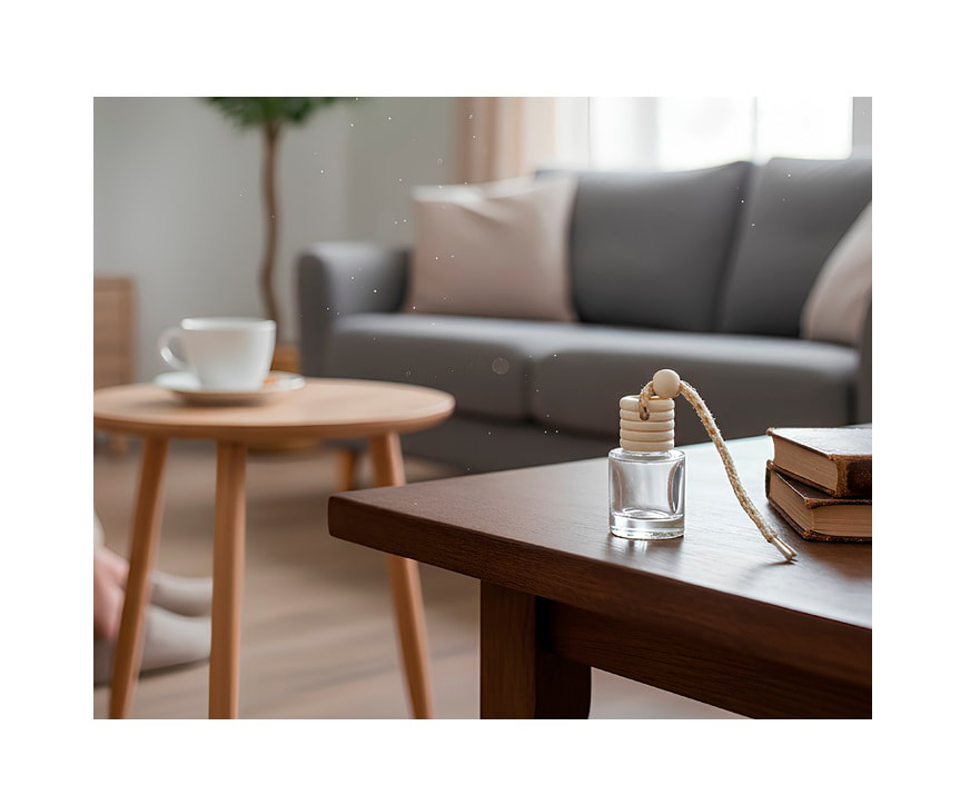 vl 033 Aromatizante con envase de vidrio, tapa de madera y sujedator de cordón. Medidas 5x2.5cm.