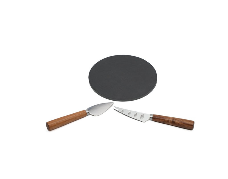 Set para quesos y carnes frías. Incluye 2 cuchillos de acero inoxidable con mango de madera de acacia y una base de piedra. Presentación: caja individual.