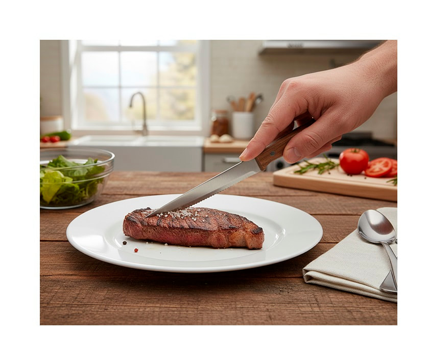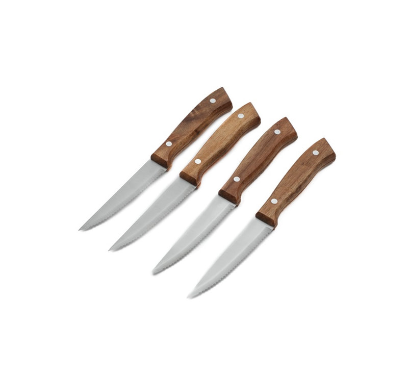 Set de 4 cuchillos de acero inoxidable para carne, con mango de madera de acacia. Presentación: caja individual.