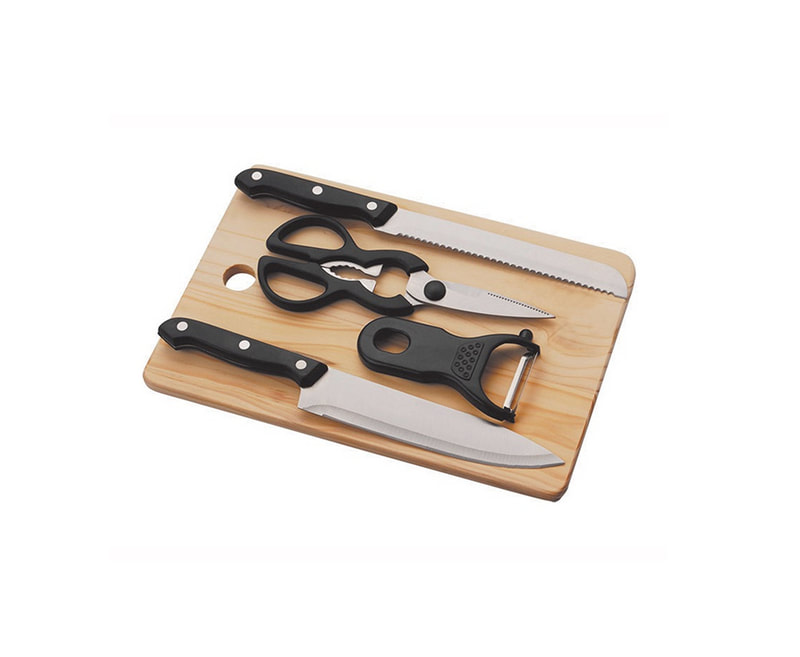 Juego de cuchillos con tabla de madera para picar, tijera multifuncional, pela papas, cuchillo para pan y cuchillo de cocina. Presentación: caja en color blanco.