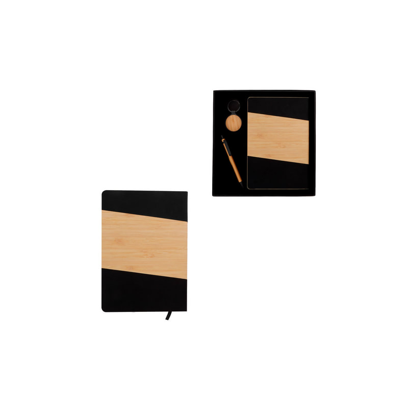 Set ejecutivo incluye: llavero metálico con detalle en bambú, bolígrafo de bambú, libreta y caja de regalo.