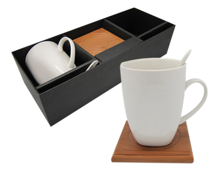 Set de regalo ejecutivo de 3 piezas. Contiene libreta de pasta dura con 80 hojas recicladas a raya y placa metálica. Incluye listón separador y elástico porta bolígrafo. Bolígrafo de plástico con mecanismo pulsador y taza de carámica con placa metálica circular. Capacidad de 473 ml. Incluye caja de regalo rígida.