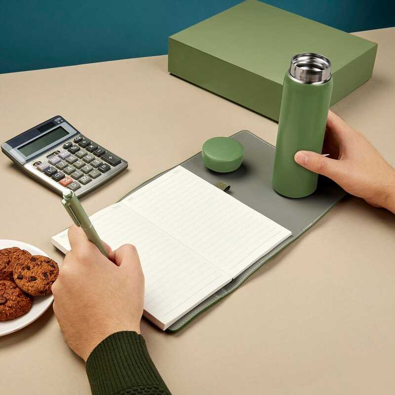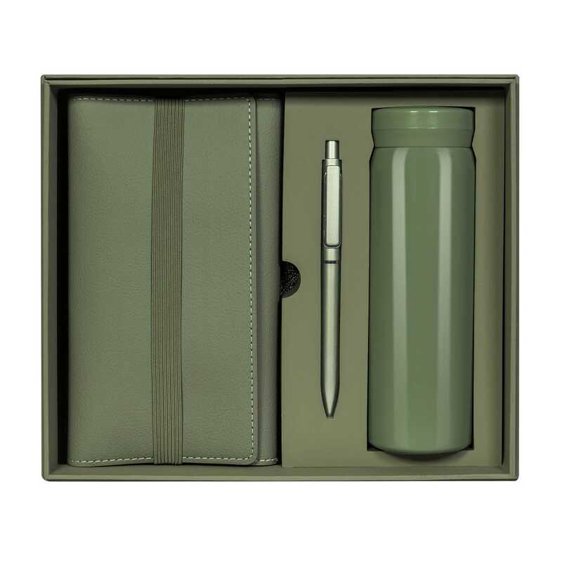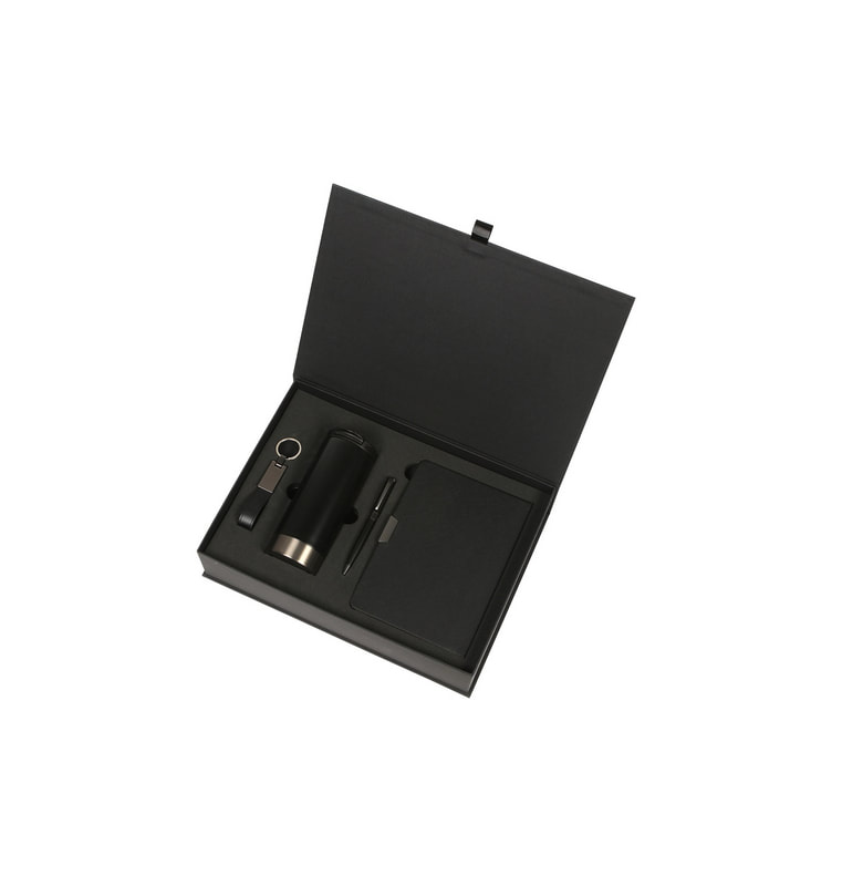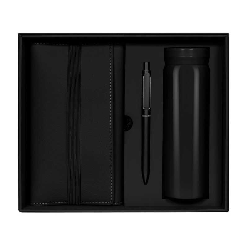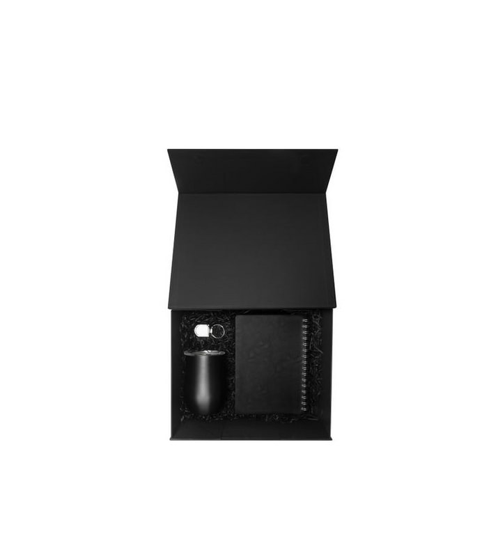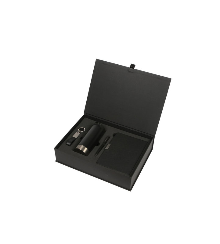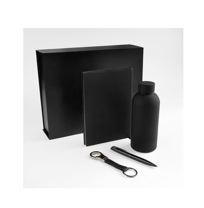 Set de regalo. Incluye libreta con 70 hojas, termo de acero inoxidable de 350 ml y llavero. La caja cuenta con cierre de solapa imantada. Brinda un regalo con estilo y utilidad. El máximo de sets disponibles para la venta está relacionado al stock de los productos que contienen.