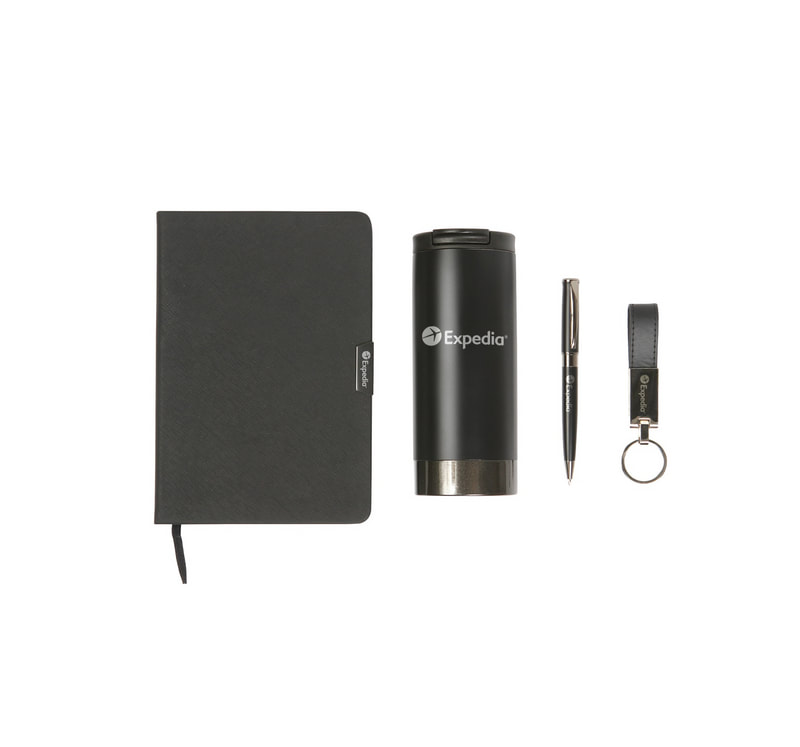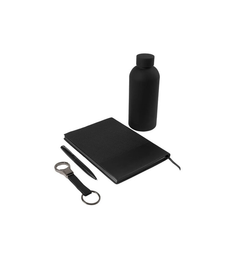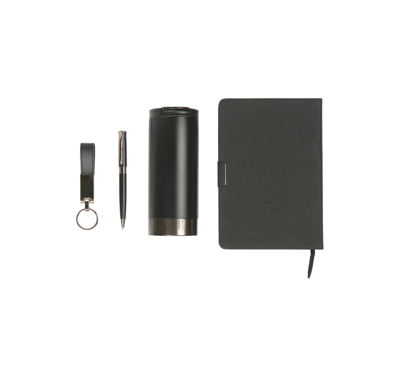 Set de regalo corporativo de 4 piezas. Incluye libreta de pasta blanda con 96 hojas a raya y listón separador, bolígrafo metálico con sistema twist, llavero de doble aro metálico con cinta de curpiel y termo de acero inoxidable de doble pared cerrado al vacío, terminado rubber que lo hace suave al tacto. Incluye caja rígida de regalo.