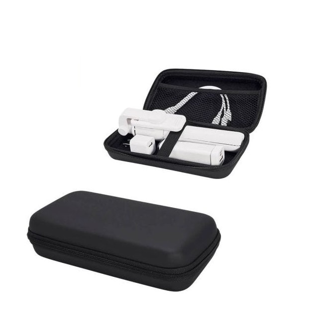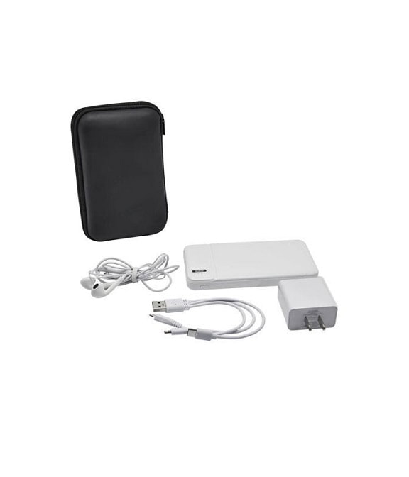 Incluye batería auxiliar para smartphone de 8,000 mAh con 2 puertos de carga Micro USB y tipo C, 2 puertos USB y 4 LEDs para indicar nivel de carga, cargador de pared con entrada USB, audífonos con control de volúmn y función play/pausa, cable cargador USB con entradas micro USB, tipo C y lightning. Incluye estuche con cierre.