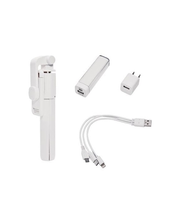 Incluye selfie stick inalámbrico con bluetooth, batería auxiliar de 2,200 mAh, cargador de pared, cable cargador USB 3-en-1 (micro USB, tipo C y lightning) y estuche.