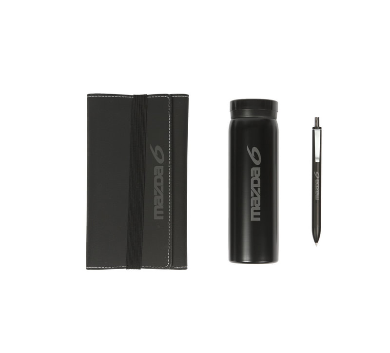 Set ejecutivo incluye: libreta de poliuretano con portada que sirve como soporte de celular, bolígrafo y termo con acabado rubber.