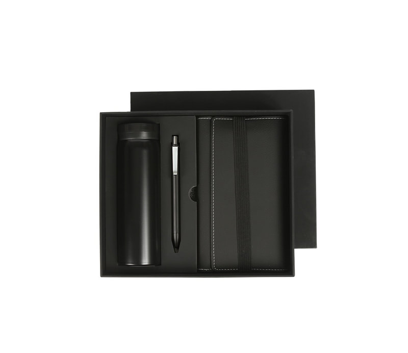 Set ejecutivo, incluye libreta con cubierta fabricada en curpiel con 80 hojas de 70g, bolígrafo con barril plástico de apariencia metálical y termo de doble pared fabricado en acero inoxidable. Incluye caja de regalo color negro.