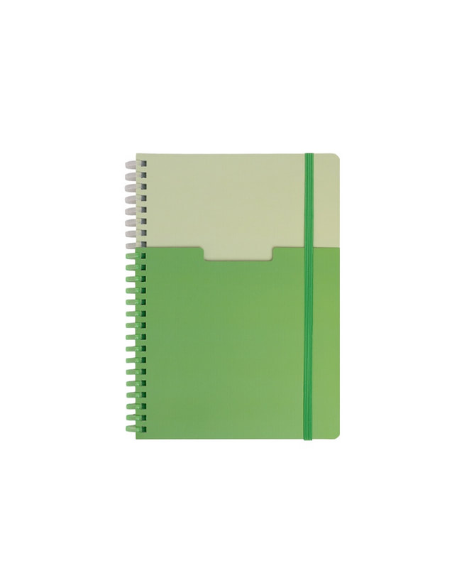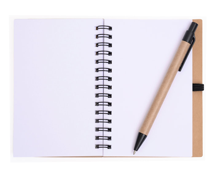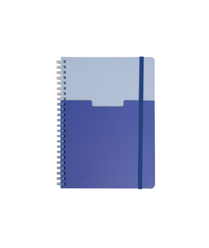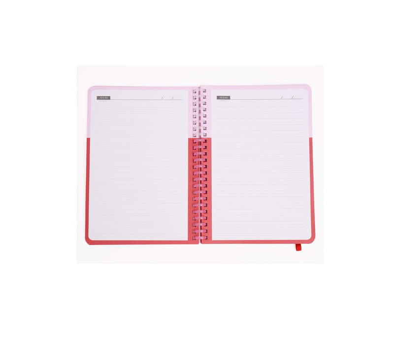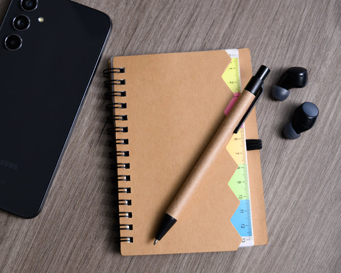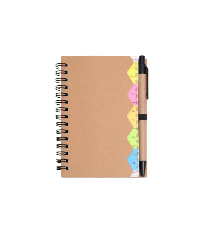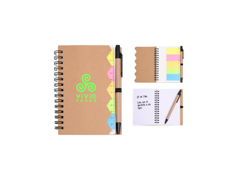 Libreta con 70 hojas de raya. Incluye banderillas adheribles de diferentes colores, bolígrafo ecológico y espiral metálico doble.