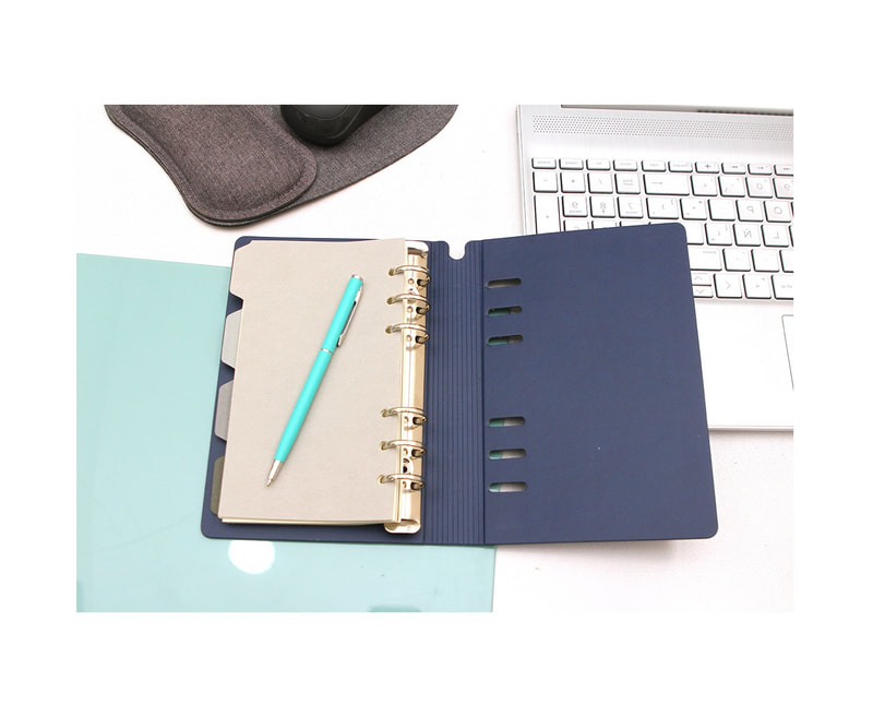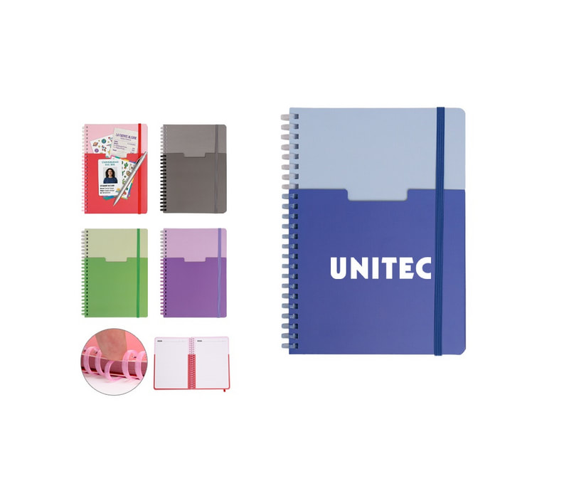 Libreta con planeador para organizar actividades diarias. Incluye dos aros metálicos, botón de presión y 60 hojas de 100 gr.