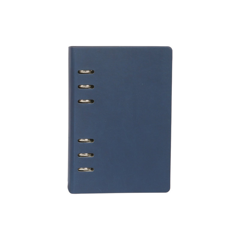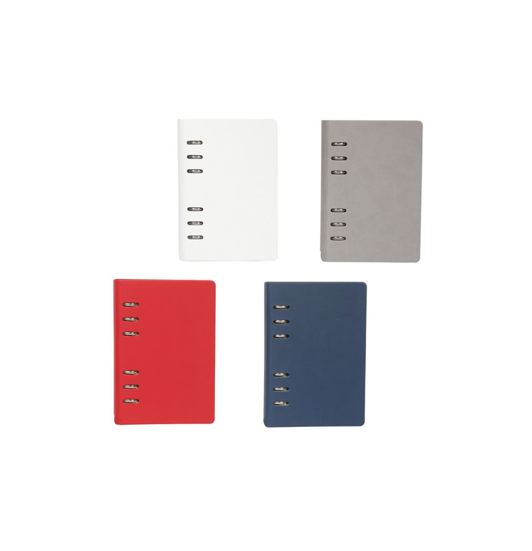 Libreta vertical A5 de pasta rígida de PU con arillo metálico del color de la libreta, cuenta con 80 hojas (160 páginas): página de datos, calendarios 2026 - 2029, 124 páginas rayadas, 32 páginas para notas punteadas y banda elástica para cerrar.