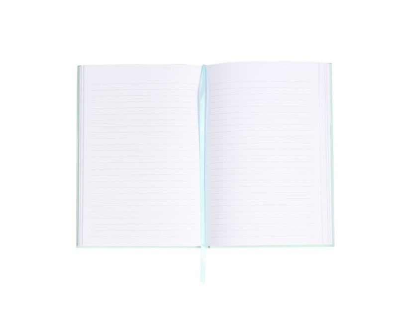 Libreta 80 Hojas Raya, papel óptico Silky con certificación FSC (Proveniente de bosques sustentables) Suave Cubierta satinada. Con sobre de papel en contraportada. Separador de listón mismo color de cubierta. Cierre con elástico. Pegada y cosida. Medidas 21 x 13 cm.