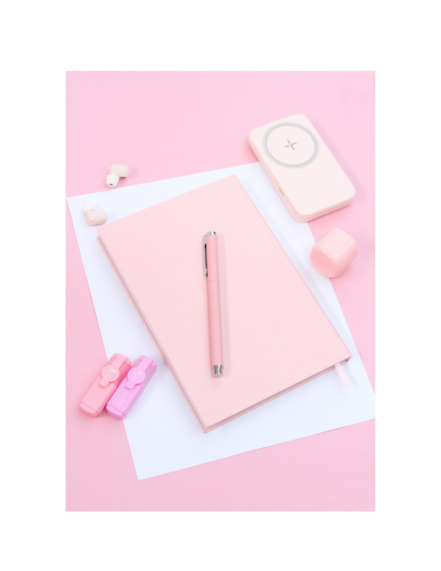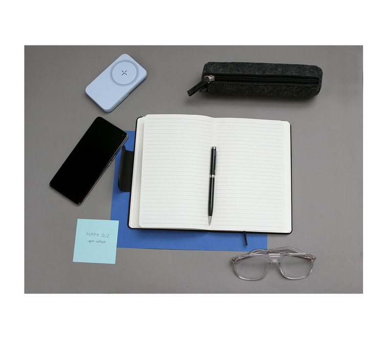 Carpeta con cargador inalámbrico y power bank de 6,000 mAh, con compartimentos para almacenaje, porta plumas y tarjetero, sujetadores de cables y base para teléfono móvil. Libreta con hojas rayadas y broches de seguridad.