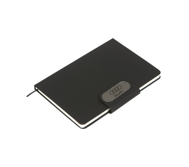 Libreta A5 poliuretano texturizado con cintillo magnético en color negro; cuenta con 80 hojas ralladas, resorte para bolígrafo y separador en color de la libreta.