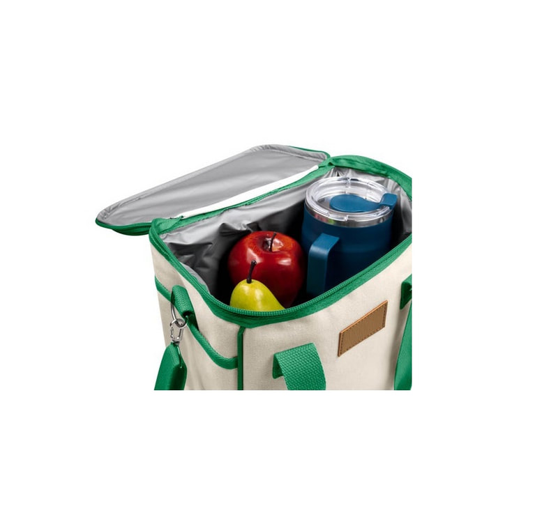 Hielera tipo bolsa con interior plastificado y sellado. Compartimento principal con diseño abierto. Asas con marco de metal. Capacidad para 12 latas.