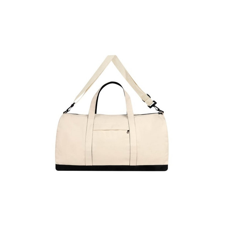 Su compartimento principal con cierre destaca por su tamaño súper amplio, perfecto para llevar todo lo necesario con comodidad. Incluye asas de mano para un fácil agarre y una práctica asa para hombro removible, sujeta con un broche de plástico para mayor seguridad. Además, cuenta con un bolsillo frontal con cierre que brinda acceso rápido a objetos pequeños o esenciales. Esta maleta ecológica está fabricada con material algodón, es la compañera ideal para viajes o escapadas de fin de semana.